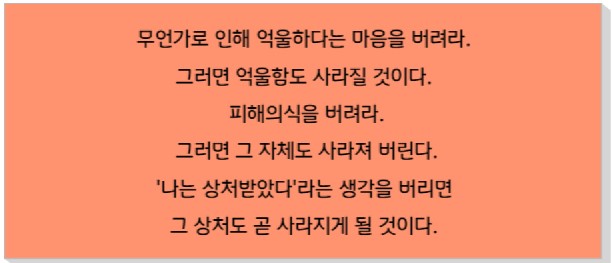 명상록에서는 파도가 끊임없이 밀려와부딪쳐도 굳건하게 버티고 서있는 바위 언덕을 닮아라라고 충고한다. 우리는 바위처럼 끄떡없이 버티기만 하면 된다. 그러면 그 거칠던 파도도 이내 잔잔해질 것이다. "이런 일이 닥쳤으니 나는 얼마나 불행한 사람인가?"라고 말하지 말고 오히려 "이런 일이 일어났지만 나는 행복하다. 나는 고통으로부터 자유롭고, 현재의 시련에 흔들리지 않고, 미래의 공포에도 압도당하지 않을 것이기 때문이다"라고 말해보자.