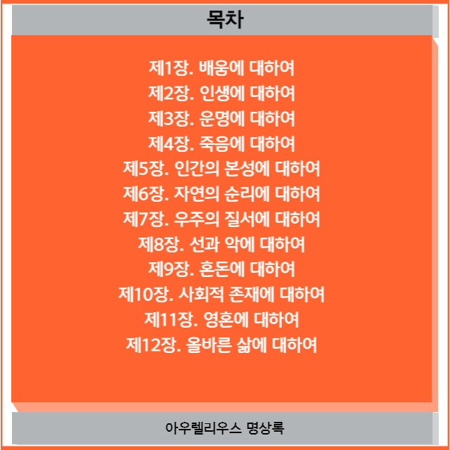 넓은 대륙은 우주의 한 줌 흙이며, 현재는 영원 속의 한순간에 불과하듯이, 만물은 끊임없는 변화와 유전을 거듭한다. 그러므로 우리 인간도 육체적 욕망에 몸을 맡기지 말고 불굴의 의지로 국가 안에서 자기가 맡은 역할을 다하는 것이 본연의 의무라는 스토아적 도덕성을 호소력 있게 전달하고 있다.