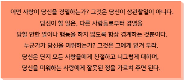 '인간은 고의적으로는 악행을 범하지 않으며 서로 참는 것이 곧 정의이다.'라고 말한 마르쿠스의 사상에 나는 전적으로 부인한다. 오히려 나는 군주론에서 마키아벨리가 말한 인간은 본래 타고난 심성이 악하다는 말을 공감한다. 하지만 적개심, 증오, 의심, 원한, 갈등 등을 품었던 수많은 악한 인간들은 이미 먼지나 재와 더불어 사라져 버리고 없다.