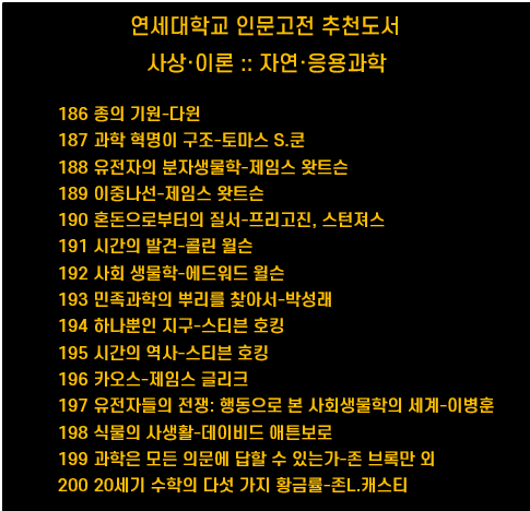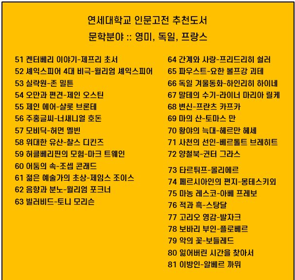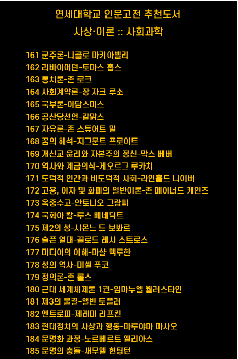 연세대학교 인문고전 추천도서는 연세대학교 교수들로 구성된 '연세필독도서 추천위원회'에서 선정한 도서 목록입니다. 다른 학교들보다 더 자세하게 분류가 되어 있다는 장점이 있는 것 같습니다. 서울대학교 추천도서랑 겹치는 부분도 있고 새로운 목록도 꽤 보입니다. 저는 일단 겹치는 부분 위주로 읽어보려고 합니다. 추천도서가 겹쳤다는 말은 더 꼭 읽어야 할 책이라는 단순한 생각 때문입니다.