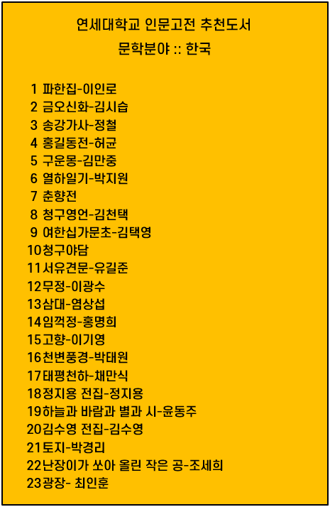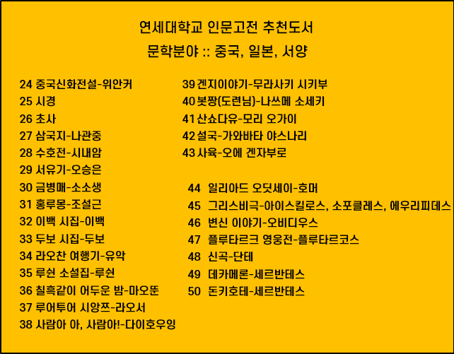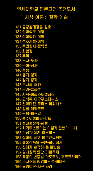 연세대학교 인문고전 추천도서는 연세대학교 교수들로 구성된 '연세필독도서 추천위원회'에서 선정한 도서 목록입니다. 다른 학교들보다 더 자세하게 분류가 되어 있다는 장점이 있는 것 같습니다. 서울대학교 추천도서랑 겹치는 부분도 있고 새로운 목록도 꽤 보입니다. 저는 일단 겹치는 부분 위주로 읽어보려고 합니다. 추천도서가 겹쳤다는 말은 더 꼭 읽어야 할 책이라는 단순한 생각 때문입니다.