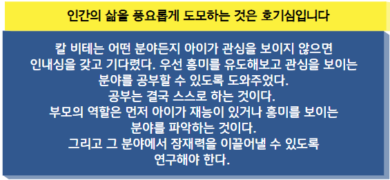 책육아를 하고자 마음먹었던 부모들이라면 칼비테 교육법에 대해 한 번쯤 들어보았을 것이라 생각됩니다. 19세기 독일의 시골 목사였던 칼비테는 발달 장애 아들을 천재로 길러냅니다. 아들은 6개 언어에 통달한 천재 법학자가 되었으며 현재까지 기네스북에 세계에서 가장 어린 박사 학위 소지자라고 합니다.