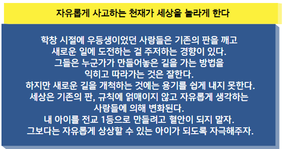 학창 시절 공부 잘하는 우등생들이 사회에서도 모두 우등생으로 인정받고 소위 잘 나가는 사람들이 되는 건 아니라는 걸 우린 경험상 잘 알고 있다. 내 아이가 지금의 나처럼 한창 사회에서 활동할 때는 2050년대이다. 2050년대를 살아가야 할 우리 아이에게 현재의 교육이 맞는걸까 하는 생각도 든다. 많이 변했다고는 하지만 아직도 학교의 시험들은 단편적인 사실들을 암기해야하고, 이해보다는 주입식의 학습이 중점이다. 나는 내 아이가 그런 우등생이 되는건 절대 바라지 않는다. 학교 공부는 못하더라도 자신의 삶을 주도적으로 살 수 있는 오너 드라이버가 되길 바란다. 가야 할 목적지를 명확히 정할 수 있고 스스로 선택한 방향과 길을 따라 주변의 멋진 풍경을 볼 수 있는 여유로움과 함께 자신의 삶을 운전해 나가는 오너 드라이버~!! 부모인 나는 그저 보조석에 앉아 혹시 잘못된 길로 들어서지는 않았는지 관찰해 주고 가는 길이 따분하거나 외롭지 않게 옆에서 말동무가 되어주면 되지 않을까?