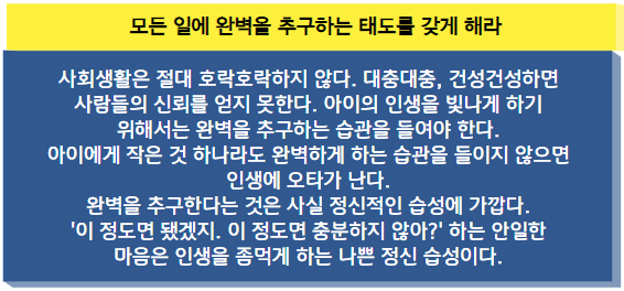 영국의 시인 존 드라이든의 말처럼 습관이 바로 내 아이가 된다는 것을 기억해야겠다. "처음에는 우리가 습관을 형성하지만, 나중에는 습관이 곧 우리를 형성한다." 내가 아이에게 잘 쓰는 말 중 하나가 "괜찮아" 란 단어다. 나는 이 단어가 대충대충이라는 습관으로 이어진다는 것을 깨달았다. 어떤 결과에 대해 아이 스스로 만족하지 못해 풀 죽어 있거나 실망해 있을 때 나는 그 정도면 충분해, 잘했다는 칭찬의 의미로 "괜찮아"라는 말을 해줬는데 나중에는 아이가 스스로 "이 정도면 됐지, 괜찮아"하는 것을 보고 내 언어 습관이 아이를 대충대충 하게 만들어버렸구나 싶었다. 그런 인식이 있은 후로는 아이에게 "조금 더 힘내"보자라는는 말을 해주게 되었다. 내 아이에게 좋은 습관을 키워주고 올바른 길을 갈 수 있도록 해주기 위해서는 엄마의 나쁜 습관을 먼저 바꿔야 함을 경험을 통해 배웠다.